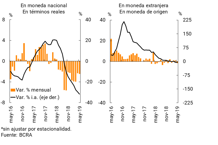 En una comparación interanual, en mayo el saldo de préstamos en moneda nacional al sector privado acumuló una caída de 31,7% real, mientras que el financiamiento en moneda extranjera se redujo 5% i.a. en moneda de origen.