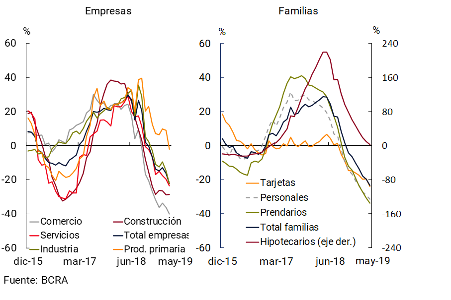 El crédito total a las empresas (en moneda nacional y extranjera) disminuyó 3,1% en términos reales con respecto a abril (-0,2% en términos nominales)6. El comportamiento mensual se reflejó en todos los sectores económicos y grupos de entidades financieras. En términos interanuales los préstamos a las empresas acumularon una caída de 22,2% i.a. real, siendo relativamente mayor en los créditos al comercio y a la construcción (ver Gráfico 7). En tanto, los préstamos a las familias (en moneda nacional y extranjera) se redujeron 1,6% real en el mes (+1,4% en términos nominales). En una comparación interanual los créditos a los hogares acumularon una disminución de 23,2% i.a. real. Las líneas prendarias y las personales mostraron las mayores caídas interanuales relativas dentro de este segmento.