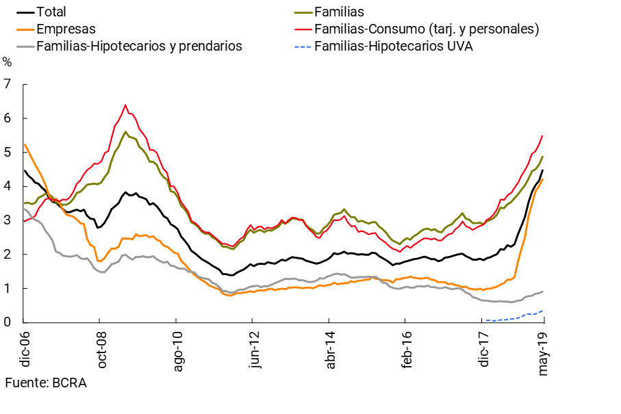 La irregularidad del crédito al sector privado representó 4,5% de la cartera total en el mes (+0,3 p.p. respecto a abril y +2,3 p.p. i.a., ver Gráfico 8). El ratio de mora de los préstamos a las empresas se situó en 4,2% en el mes (+3,1 p.p. i.a.), mientras que el de los créditos a las familias se ubicó en 4,9% en mayo (+1,5 p.p. i.a.). El coeficiente de irregularidad de los créditos hipotecarios en UVA a las familias se mantuvo sin cambios en el período en el orden de 0,3%, mientras que el de las restantes líneas hipotecarias se incrementó levemente hasta situarse en 0,7%.7