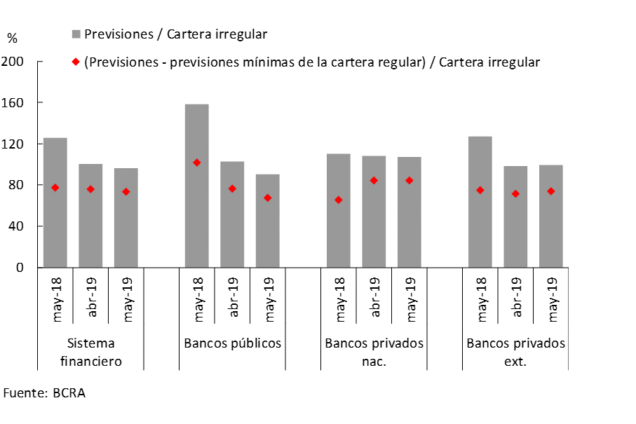 El saldo estimado de previsiones atribuible a la cartera en situación irregular representó 73% de dicha cartera, reduciéndose levemente en comparación con el registro de abril principalmente por el desempeño de los bancos públicos (ver Gráfico 9). Por su parte, el saldo de previsiones contables totales (considerando tanto las adjudicadas a la cartera regular y a la irregular) representó 96% de los préstamos en situación irregular al sector privado.