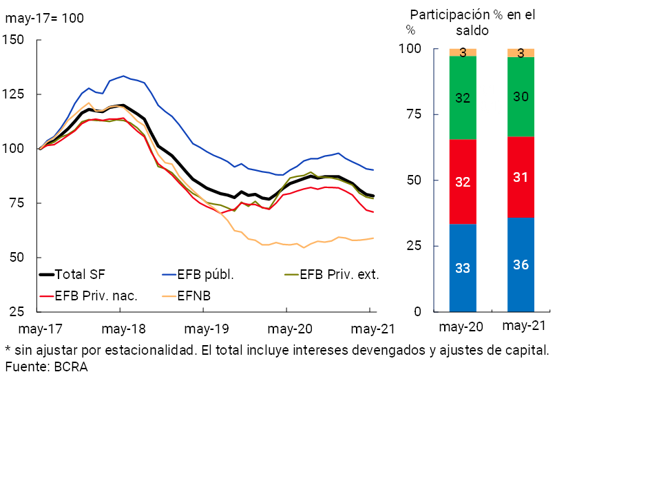 En mayo la actividad de intermediación financiera con el sector privado en moneda nacional mostró un desempeño débil. Esto se produjo en un marco en el que aún se observan los efectos del contexto de pandemia, que llevó a la adopción de medidas focalizadas y transitorias para evitar consecuencias irreversibles para la salud pública1, con efectos sobre la movilidad de la ciudadanía y sobre la actividad económica. Teniendo en cuenta las principales variaciones del balance del sistema financiero en moneda homogénea sobre las partidas en pesos2, durante mayo se redujo en cierta medida el saldo de crédito al sector privado y se incrementaron los depósitos del sector público. Estos movimientos se dieron en un escenario de incremento de la liquidez en sentido amplio del agregado del sistema financiero. Por su parte, considerando las principales variaciones del balance agregado para el segmento de partidas en moneda extranjera —expresadas en moneda de origen—, en mayo se verificó una caída de la liquidez y un aumento de los depósitos del sector privado, que se aplicaron fundamentalmente a incrementar las financiaciones al sector privado en esta denominación.