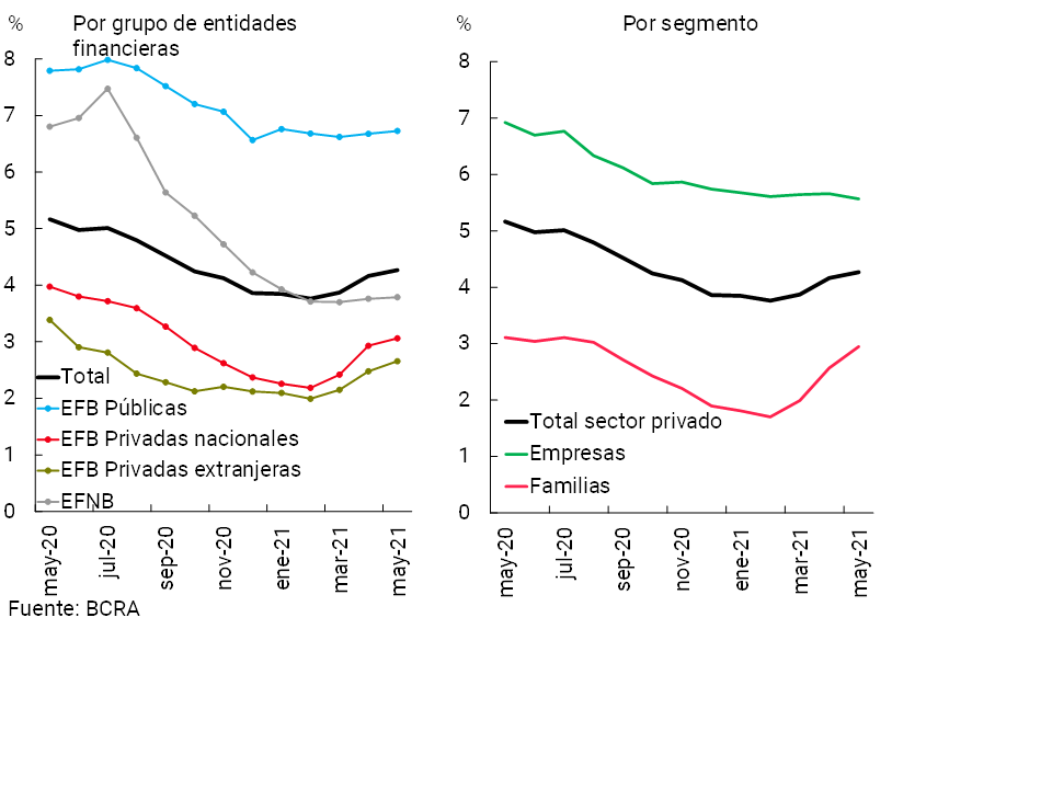 Entre abril y mayo el BCRA dispuso un cronograma de transición para la clasificación de las personas deudoras que efectúan las entidades financieras. Hasta marzo de 2021 se debía incrementar los plazos de mora admitida para las situaciones 1, 2 y 3 en 60 días12, período que se redujo a 30 días para abril y mayo de este año, mientras que a partir de junio se vuelven a utilizar los criterios preexistentes al 19/03/202013. En paralelo, se mantiene la política de focalización de las medidas de alivio financiero hacia los sectores más afectados por la pandemia, permitiendo a las entidades financieras incorporar al final de la vida del crédito las cuotas impagas de asistencias otorgadas a las personas deudoras que sean empleadores alcanzados por el REPRO II. En ese contexto, el ratio de irregularidad del crédito al sector privado para el sistema financiero agregado ascendió hasta 4,3% en mayo, levemente por encima del registro de abril (-0,9 p.p. i.a.), desempeño principalmente explicado por las entidades financieras privadas (ver Gráfico 11).