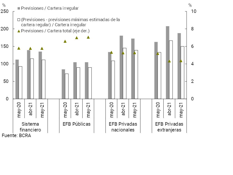 Las previsiones contabilizadas por el sistema financiero agregado representaron 5,8% del crédito total al sector privado en mayo, en línea con el registro de abril y del mismo mes del año anterior (ver Gráfico 13). Las previsiones totales en términos de la cartera irregular se ubicaron en 135,3% en el mes (-4 p.p. mensual y +23,1 p.p. i.a.). Por su parte, en mayo el saldo de previsiones regulatorias atribuibles a la cartera irregular (siguiendo los criterios de las normas de previsiones mínimas regulatorias por riesgo de incobrabilidad) totalizó 111,5% de dicha cartera.