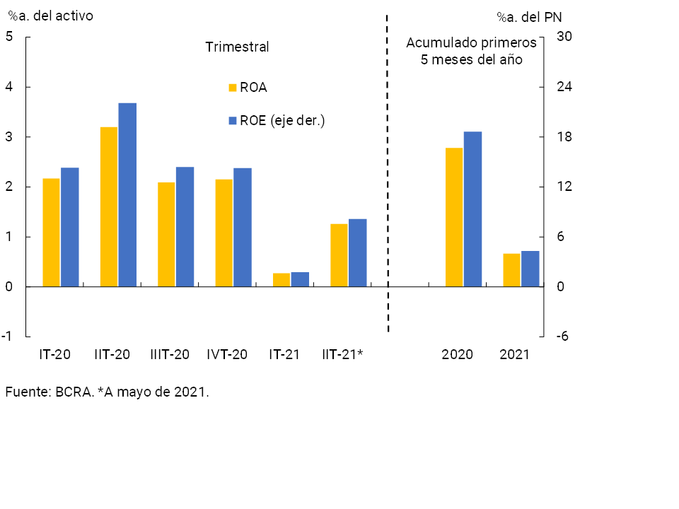 • En los primeros 5 meses del año el sistema acumuló resultados totales integrales equivalentes a 0,7%a. -anualizado- del activo (ROA) y a 4,3%a. del patrimonio neto (ROE). Estos niveles resultaron inferiores a los registrados tanto en el mismo período del año pasado como en acumulado de todo 2020.
