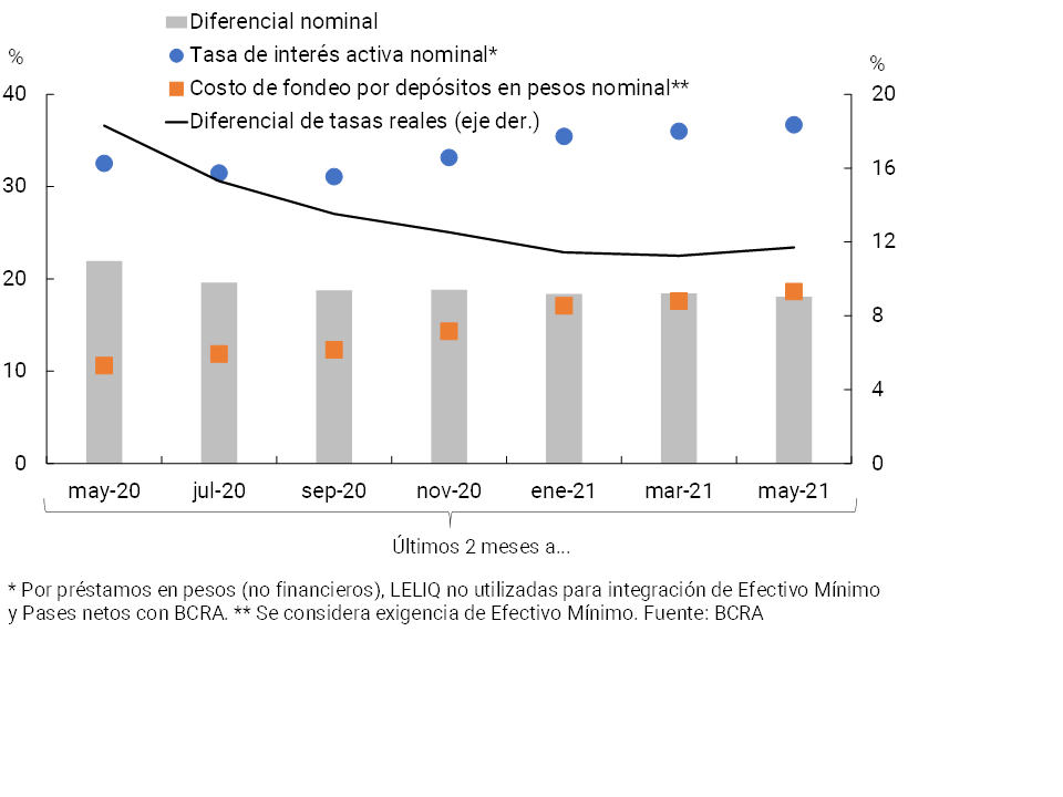 16 En la definición utilizada para estas tasas de interés implícitas no se contempla el efecto de: gastos de administración, egresos impositivos, costo de capital ni otros componentes asociados a cobertura por riesgos intrínsecos a la operatoria de intermediación financiera. Las tasas de interés implícitas se estiman considerando el flujo acumulado y anualizado para 2 meses. Para mayor detalle respecto de la metodología de cálculo, ver ediciones anteriores del “Informe sobre Bancos”.
