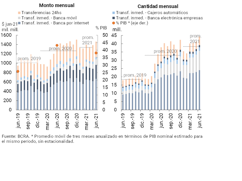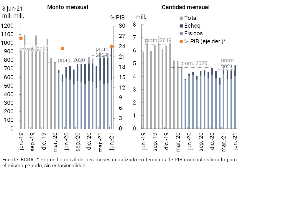 • Los montos cursados a través de las transferencias de fondos inmediatas se expandieron 15,1% real en los últimos 12 meses a junio (última información disponible). Dentro de este segmento, se destacó el dinamismo de la banca móvil (54,6% interanual -i.a.- considerando montos reales), impulsado por el mayor uso de las billeteras electrónicas. Las operaciones con tarjeta de débito a través del comercio electrónico aumentaron 34,8% i.a. real en términos de montos. Por su parte, el valor compensado de cheques electrónicos (ECHEQs) se incrementó significativamente en el último año (medido en términos reales), casi triplicando su valor.