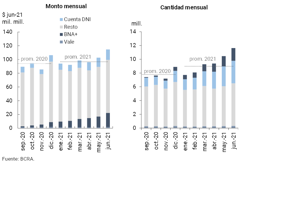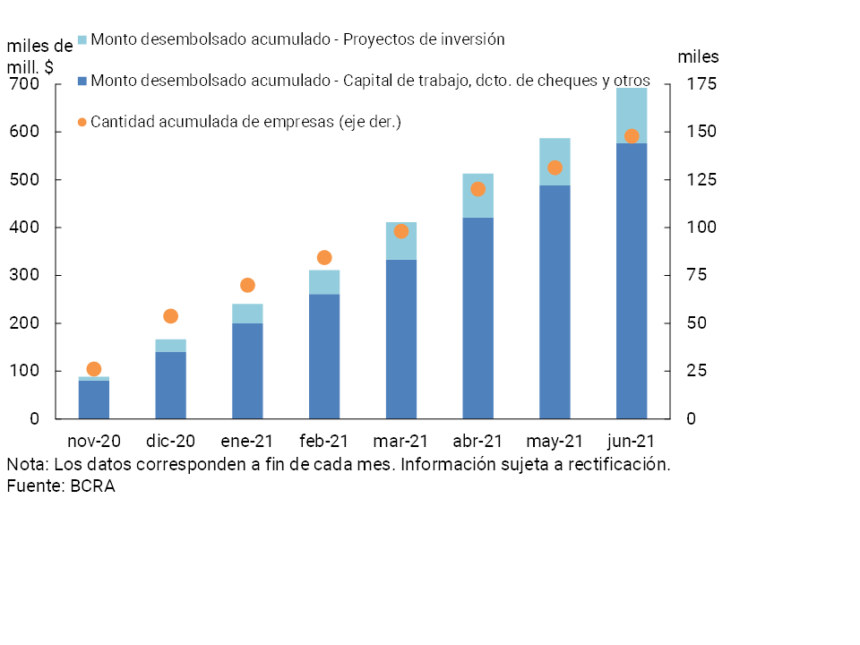 Paralelamente, mediante la línea de financiamiento a tasas de interés subsidiadas para empresas inscriptas en el “Programa de Asistencia de Emergencia al Trabajo y la Producción” (ATP)7, se llevan otorgados 20.940 préstamos por un monto total acumulado de $14.306 millones hasta fines de junio.