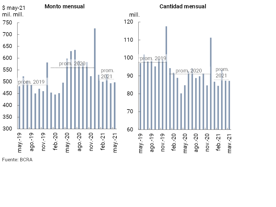 En mayo (última información disponible) las extracciones por cajero automático no presentaron cambios de magnitud al comparar con abril (-0,1% en cantidades y +0,8% en montos reales, ver Gráfico 21). De esta manera, las extracciones por cajero automático efectuadas durante el período se mantuvieron en niveles similares al promedio del año, tanto en cantidades como en montos reales. Con relación al mismo mes del año anterior, las extracciones de efectivo vía cajeros automáticos aumentaron en cantidades (2,9%) y disminuyeron en montos reales (-16,8%). Así, en el promedio del año se observa una disminución en estas operaciones (tanto en cantidades como en montos reales) al compararlas con la media de 2020.