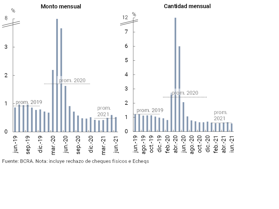 El rechazo de cheques por falta de fondos en términos del total compensado se redujo en junio (-0,08 p.p. tanto para cantidades como montos, hasta alcanzar niveles de 0,58% el primer caso y 0,53% para el segundo), manteniéndose así en registros acotados, similares al promedio mensual de 2021 (ver Gráfico 23).