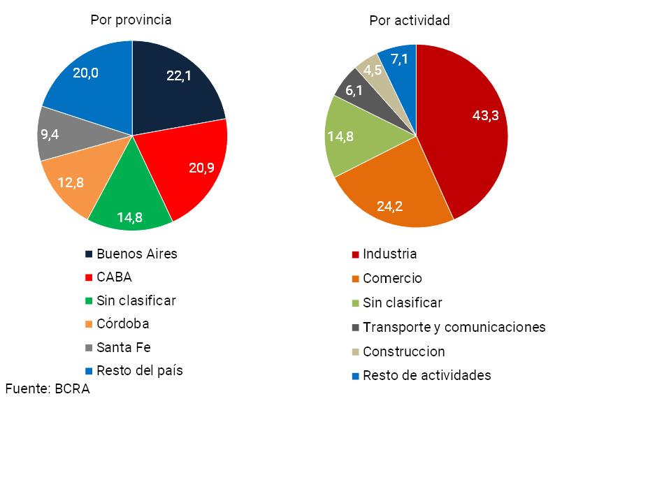 En lo que va del año se siguió profundizando el alcance de la Línea de Financiamiento para la Inversión Productiva (LFIP) de MiPyMEs5. Desde su implementación —a mediados de octubre de 2020— y hasta fines del primer semestre de 2021 se llevan otorgados más de $692.400 millones (40,5% corresponde al cupo 2021), alcanzando a 147.809 empresas (Ver Gráfico 2). Se estima que el 22,1% del saldo promedio diario vigente a mayo de 2021 fue otorgado a empresas con domicilio fiscal en la provincia de Buenos Aires, el 20,9% en CABA, el 12,8% en Córdoba y el 9,4% en Santa Fe (ver Gráfico 3). Por su parte, diferenciando por tipo de actividad, el 43,3% del saldo fue canalizado a la industria, seguido por el comercio con el 24,2%.