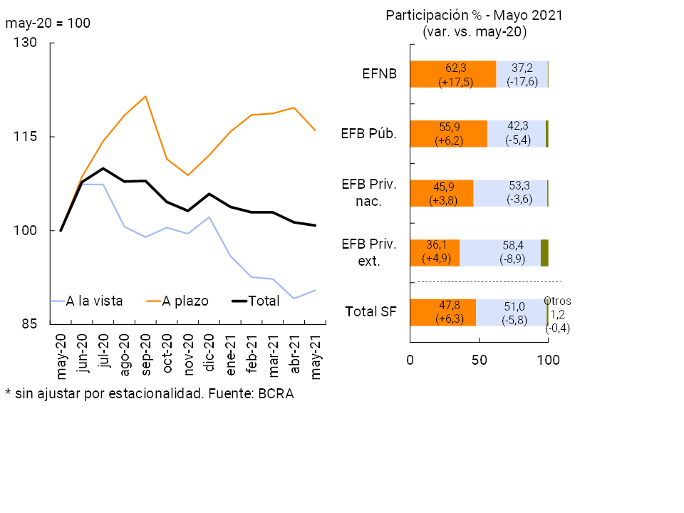 El saldo de depósitos en moneda extranjera del sector privado se incrementó 1,3% en el mes —en moneda de origen—, desempeño reflejado en todos los grupos de entidades financieras. En este contexto, en mayo los depósitos totales (en moneda nacional y extranjera) del sector privado disminuyeron 0,6% en términos reales (+2,7% nominal).
