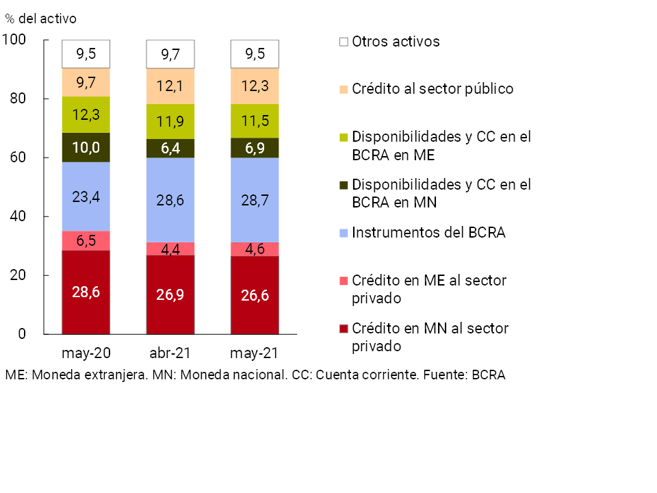 Respecto a los componentes del activo total del sistema financiero, en mayo aumentó la ponderación del saldo de las cuentas corrientes en el BCRA en moneda nacional, del financiamiento al sector público y del crédito al sector privado en moneda extranjera (ver Gráfico 7). Por su parte, en el período se redujo la importancia relativa del saldo en cuenta corriente en moneda extranjera que las entidades tienen con esta institución y de las financiaciones en pesos al sector privado.