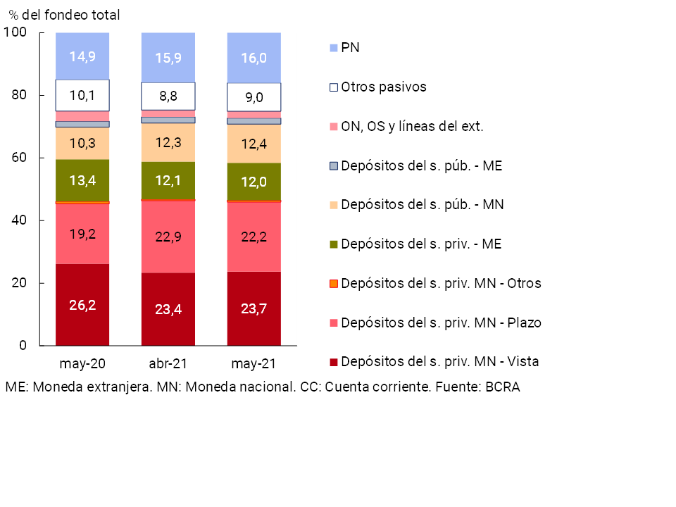 Las tasas de interés de política monetaria y las tasas de interés pasivas nominales operadas en pesos durante mayo permanecieron sin variaciones significativas respecto a abril. El ratio entre el saldo de depósitos a plazo y el saldo de las cuentas a la vista del sector privado en moneda nacional continuó ubicándose por encima del promedio registrado en los últimos años.