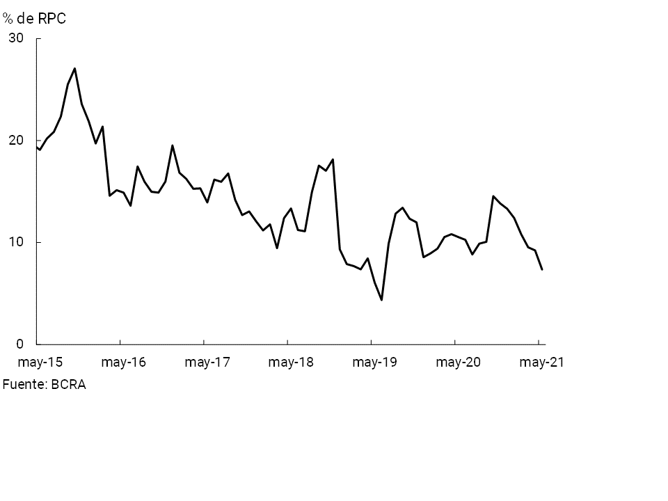 • El sistema financiero continuó evidenciando elevados márgenes de liquidez, tanto desde una perspectiva histórica como en relación a los estándares recomendados internacionalmente. En mayo los activos líquidos en sentido amplio representaron 66,5% de los depósitos totales (62,9% para las partidas en moneda nacional y 81,7% para el segmento en moneda extranjera), 0,4 p.p. y 0,7 p.p. más que en abril pasado y el mismo mes de 2020, respectivamente.