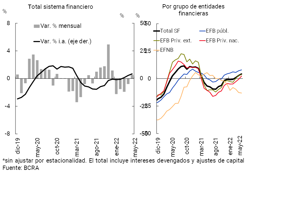 Considerando las partidas en moneda extranjera, en mayo el saldo de crédito al sector privado aumentó 2% —en moneda de origen—con respecto a abril. De esta manera, el saldo de financiaciones totales (en moneda nacional y extranjera) al sector privado acumuló un incremento de 0,6% real en el mes (+5,7% nominal).