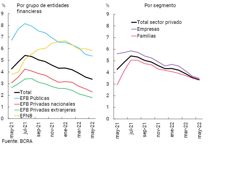 En mayo el ratio de irregularidad del crédito al sector privado se redujo 0,2 p.p. hasta 3,4% (-0,9 p.p. i.a.) para el agregado de entidades (ver Gráfico 10)12. La caída en el indicador de morosidad se reflejó en todos los agrupamientos de entidades, tanto en el segmento de créditos a empresas como a familias.