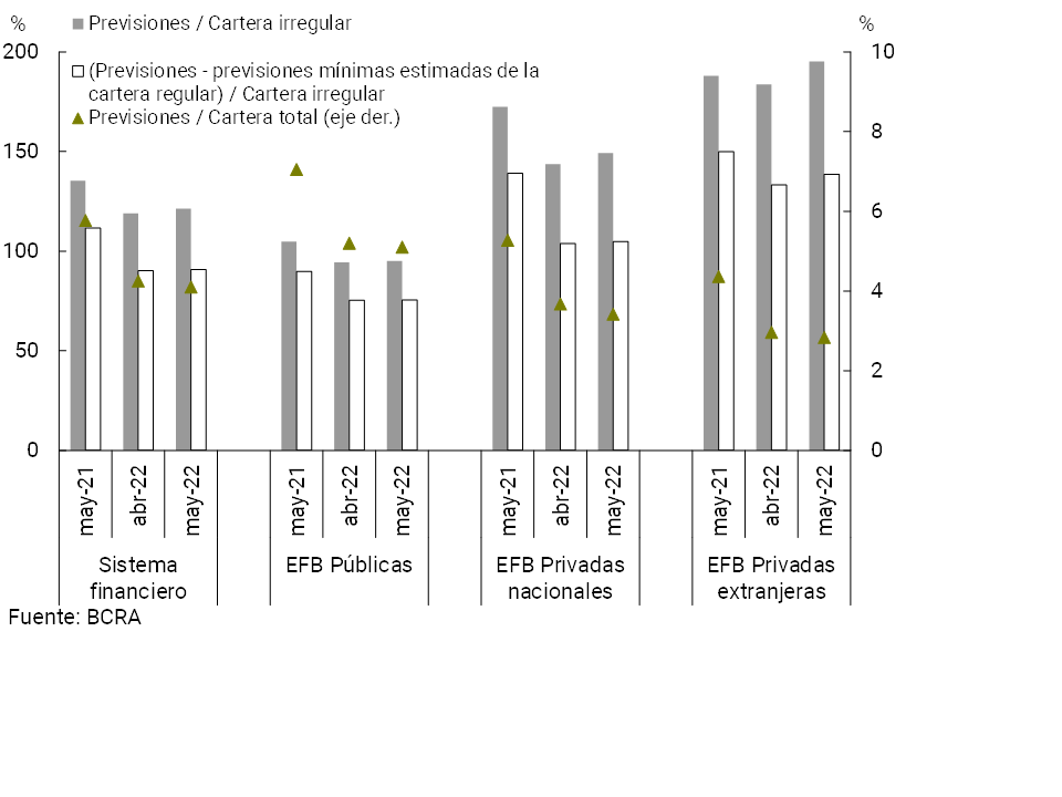 En mayo las previsiones totales del sistema financiero agregado representaron 4,1% del crédito total al sector privado (ligeramente menor que el registro de abril y 1,7 p.p. por debajo del valor de un año atrás) y 121,3% de la cartera irregular (+2,4 p.p. mensual y -14 p.p. i.a.) (ver Gráfico 12). En el período las previsiones netas de aquellas que regulatoriamente corresponden a la cartera en situación 1 y 2 (siguiendo los criterios de las normas de previsiones mínimas regulatorias por riesgo de incobrabilidad) totalizó 90,8% de la cartera en situación irregular a nivel sistémico.