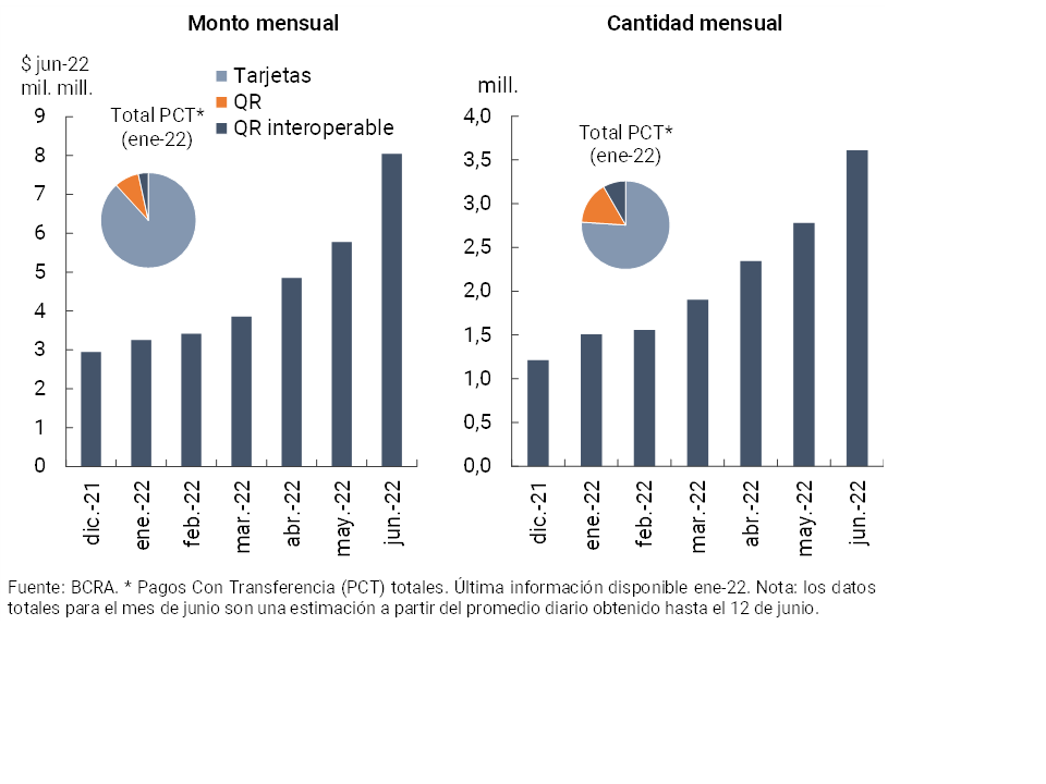 • Los medios de pago electrónico observaron un destacado dinamismo en lo que va de 2022. En junio las transferencias inmediatas (TI) se incrementaron 79,8% i.a. en cantidades y de 29,9% i.a. real en montos. Este comportamiento se reflejó tanto en las transacciones entre cuentas abiertas en entidades financieras vía CBU, así como en las operaciones donde intervienen cuentas en proveedores de servicios de pago —PSP— desde y/o hacia CVU. Los pagos con transferencia (PCT) iniciados a través de códigos QR interoperables continuaron en ascenso, acumulando casi 15 millones de operaciones ($32.300 millones a valores de jun-22) desde que rige plenamente este esquema (fines de noviembre de 2021). La compensación de ECHEQs siguió mostrando un destacado avance (70% i.a. en cantidades y 46,1% i.a. en montos reales) explicando más de la mitad de la cantidad de documentos compensados.