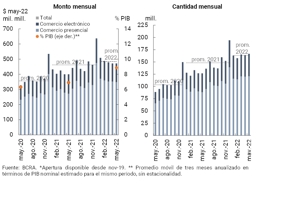 Durante mayo (última información disponible) no se registraron cambios en comparación al mes anterior en las operaciones de tarjetas de débito tanto en cantidades como en montos reales. En términos interanuales las operaciones con tarjetas de débito crecieron significativamente (+31,4% en cantidades y +17,9% real en montos, ver Gráfico 18). Este comportamiento se reflejó con mayor dinamismo en las operaciones presenciales en línea con la mayor movilidad de las personas con relación a los meses de pandemia22. De esta manera, se estima que las operaciones mediante tarjeta de débito representaron 8,9% del PIB (2 p.p. más que en igual mes del año anterior).