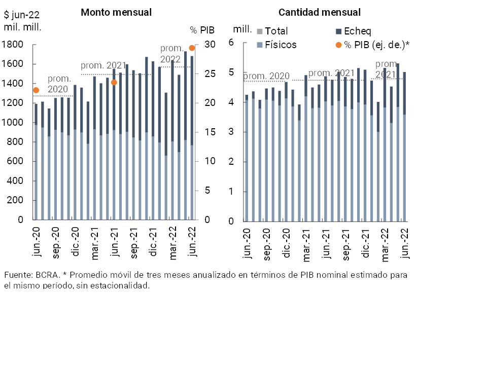 En junio disminuyó la compensación de cheques respecto al mes anterior (-5,4% en cantidades y -2,7% real en montos). Respecto al mismo período del año anterior, estas operaciones se crecieron 2,9% en cantidades y 8,6% real en montos. Dado el mejor desempeño relativo, los ECHEQs continuaron incrementando su ponderación en la compensación total: en junio representaron 28,7% en cantidades (+11,4 p.p. i.a.) y 54,5% en montos reales (+14 p.p. i.a., ver Gráfico 19). Se estima que en el período el monto de cheques compensados (tanto físicos como electrónicos) fue equivalente a 29,4% del PIB (+5,9 p.p. i.a.).