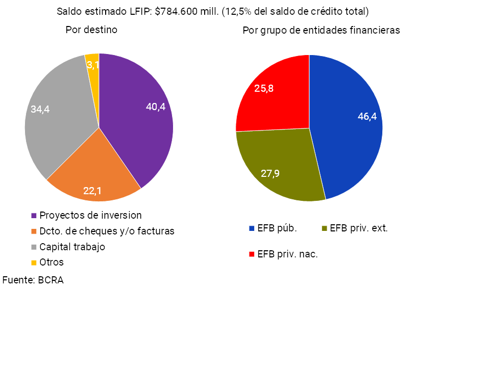 La evolución positiva de los préstamos comerciales4 en el último año fue explicada en parte por la Línea de Financiamiento para la inversión productiva de MiPyMEs (LFIP), uno de los principales programas de estímulo crediticio implementados por el BCRA. Los desembolsos mediante esta herramienta totalizaron casi $2,5 billones en términos nominales desde su lanzamiento en octubre 2020 y hasta junio de 2022, beneficiando a más de 284.500 empresas. De esta manera, se estima que a mayo el saldo de crédito de la LFIP alcanzó cerca de $784.600 millones, representando 12,5% del saldo total de crédito al sector privado del sistema financiero. Al distinguir por destino crediticio se observa que cerca de 40,4% del saldo fue canalizado a proyectos de inversión, 34,4% a capital de trabajo y 22,1% a descuento de cheques y/o facturas (ver Gráfico 2). Las entidades financieras públicas explicaron casi la mitad del saldo estimado de crédito de la LFIP (46,4%), seguidas por las privadas extranjeras y nacionales5.