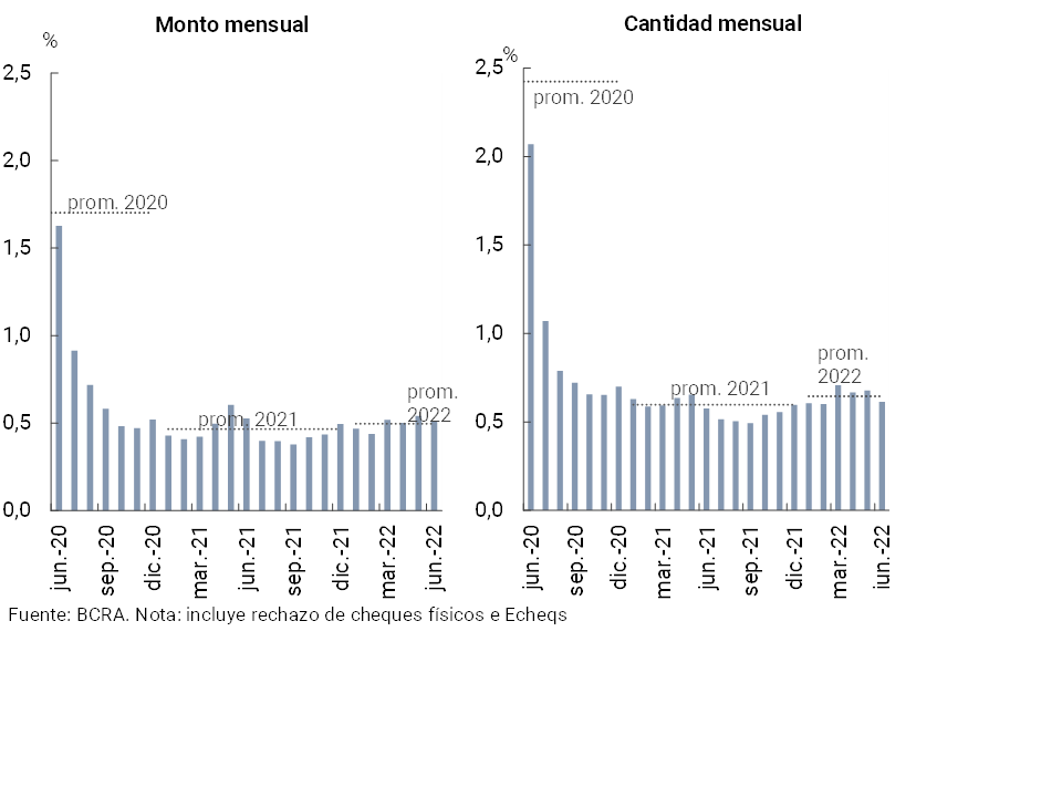 En junio el ratio de rechazo de cheques por falta de fondos en términos del total compensado23 disminuyó respecto al mes anterior (hasta 0,61% en cantidades y 0,51% en montos, ver Gráfico 20), manteniéndose en un rango acotado de valores, similar al del promedio de 2021 y de 2022.