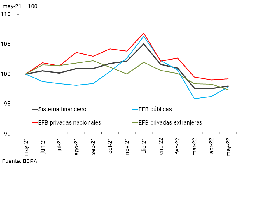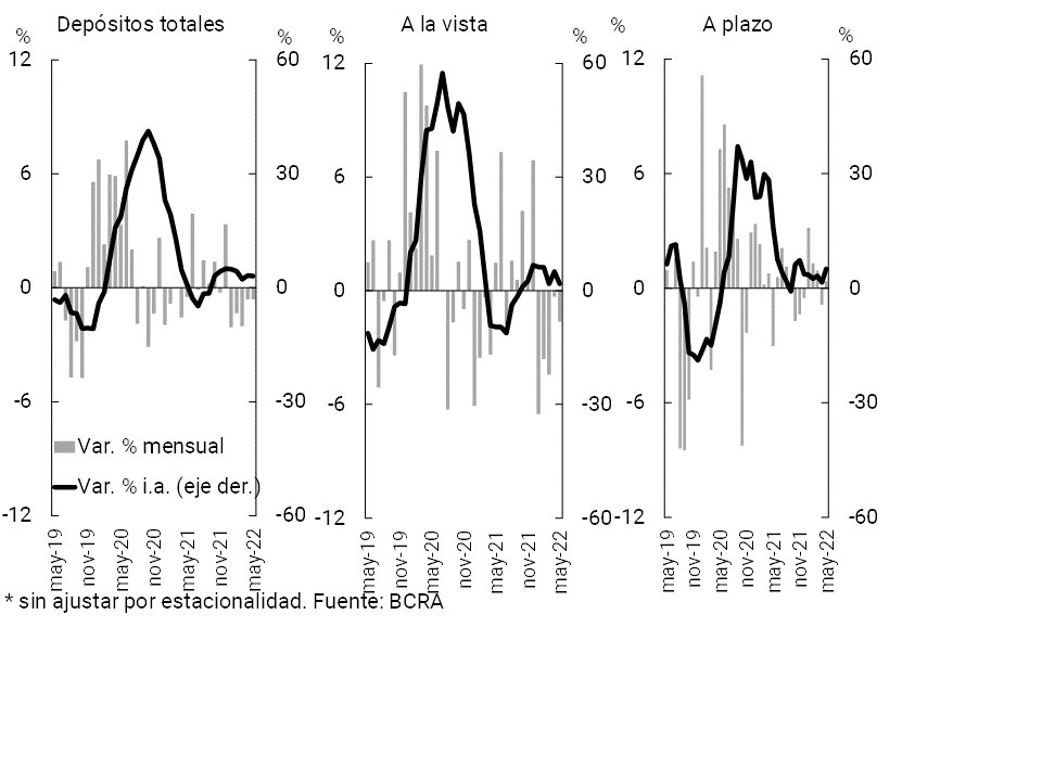 • El saldo de los depósitos totales en pesos se incrementó 0,6% real en mayo, fundamentalmente por el desempeño del sector público. El saldo real de los depósitos del sector privado en pesos disminuyó levemente en el mes principalmente por las cuentas a la vista, ya que los depósitos a plazo crecieron. Los depósitos a plazo en UVA, que ofrecen retornos reales positivos, continuaron aumentando a un ritmo elevado (11,5% real mensual), siendo concertados principalmente por las personas humanas. En pos de generar retornos reales positivos en las inversiones en pesos, fortalecer el mercado de deuda pública en pesos y avanzar en el uso de instrumentos del Tesoro como herramientas de política monetaria, a mediados de julio el BCRA decidió comenzar a utilizar para el diseño de la política monetaria y financiera un corredor de tasas de interés. Además, frente al contexto de volatilidad que se evidenció a partir de junio, el BCRA ofrecerá a las entidades financieras una opción de venta (“put option”) sobre los títulos del Gobierno Nacional adjudicados a partir de julio de 2022 y que tengan vencimiento antes del 31 de diciembre de 2023.