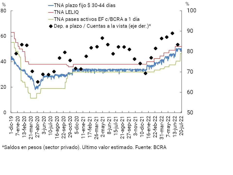 9Ver Nota de prensa del “15/07/22”. Esta política fue acompañada con un nuevo sistema instrumentado por el BCRA para reducir la volatilidad de los títulos del Tesoro (ver sección Liquidez y Solvencia).