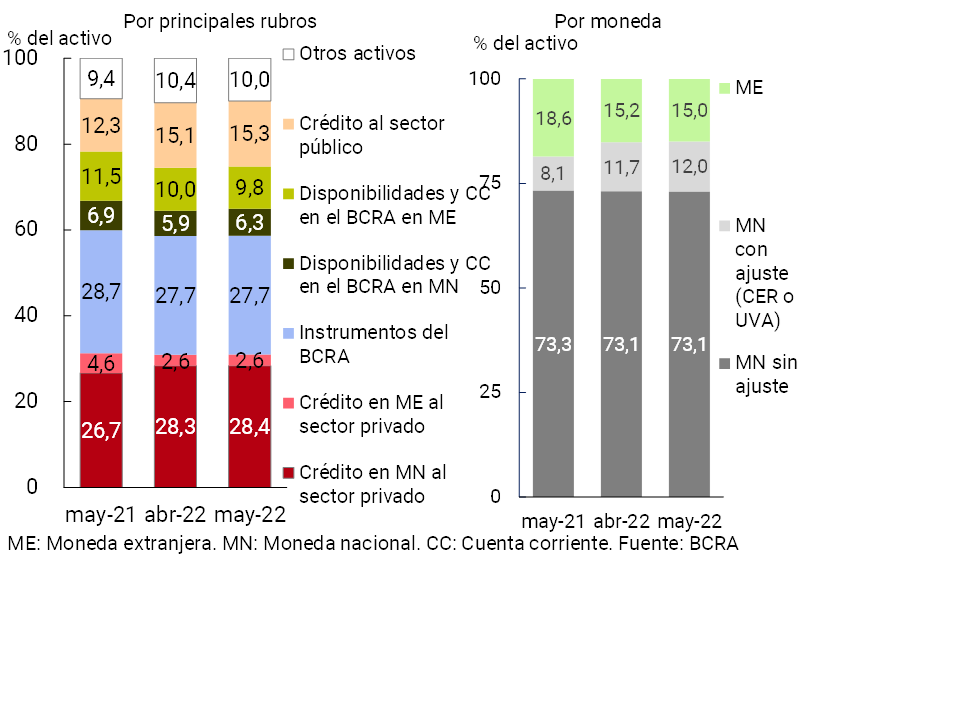 En cuanto a la estructura del activo total del conjunto de entidades financieras, en mayo aumentó levemente la ponderación del saldo de disponibilidades en pesos, del crédito al sector público y, en menor medida, del crédito al sector privado (ver Gráfico 7). Considerando los activos por moneda, en el período aquellos concertados en pesos con cláusula de ajuste por CER y/o UVA incrementaron ligeramente su participación en el total, mientras que se redujo la de los activos en moneda extranjera.