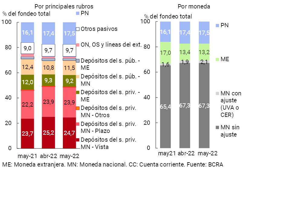 Con relación a la composición del fondeo total del sistema financiero agregado, en mayo el saldo de depósitos del sector público en moneda nacional ganó importancia relativa en el total, en tanto que los depósitos a la vista del sector privado la redujeron (ver Gráfico 8). El resto de los rubros que integran el fondeo no presentaron grandes cambios en el período. Al diferenciar el fondeo total por monedas, las partidas en pesos con cláusula de ajuste por CER o en UVA aumentaron su ponderación en el mes, reduciéndose la relevancia de aquellas denominadas en moneda extranjera.