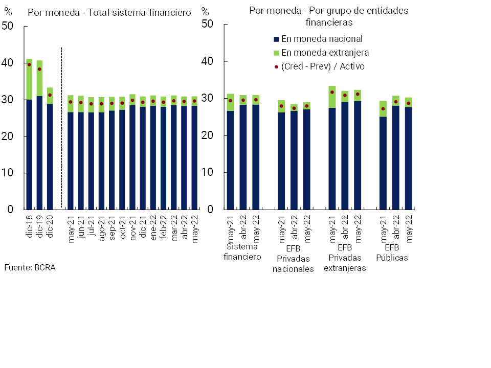 En mayo la exposición bruta del sistema financiero al sector privado (contemplando moneda nacional y extranjera) se ubicó en 31% del activo total11, en línea con el registro de abril (+0,1 p.p.) y de mayo de 2021 (-0,3 p.p. i.a.). De considerar sólo el financiamiento en pesos, el indicador se situó en 28,4% en el período (sin cambios en el mes y +1,7 p.p. i.a.) (ver Gráfico 9). La ponderación del crédito al sector privado en moneda extranjera en el activo total se mantuvo en torno a 2,6% (-2 p.p. i.a.). En cuanto a la exposición bruta del sistema financiero al sector público, ésta totalizó 15,3% del activo en mayo, sin cambios significativos respecto al mes pasado (+0,1 p.p.) y +3 p.p. i.a.