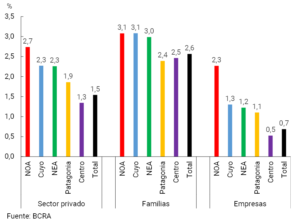 En noviembre el ratio de irregularidad del crédito al sector privado permaneció estable, en torno a 1,5%. El indicador de morosidad de las financiaciones a los hogares aumentó levemente en el mes (hasta 2,6%), desempeño explicado principalmente por las tarjetas. Por otro lado, el ratio de irregularidad de las financiaciones a las empresas se mantuvo sin cambios significativos en el mes (en 0,7%). Los niveles relativos de morosidad resultaron similares en los distintos grupos de bancos, mientras que las EFNB mantuvieron niveles superiores para este indicador (ver Gráfico 9). Los ratios de irregularidad del crédito a las familias y del crédito a las empresas presentan cierta heterogeneidad entre las distintas regiones del país. El menor registro corresponde a la cartera de deudores radicados en la zona centro del país, seguidos de la Patagonia; mientras que el mayor nivel relativo lo verifican aquellos domiciliados en NOA, fundamentalmente en el segmento familias (ver Gráfico 10)7.