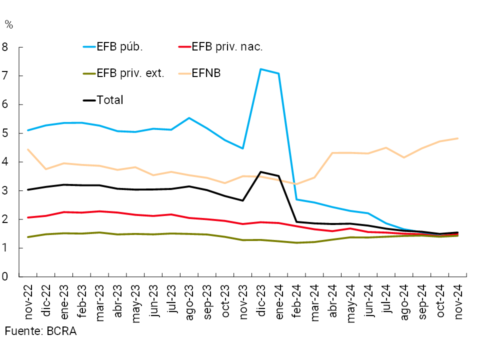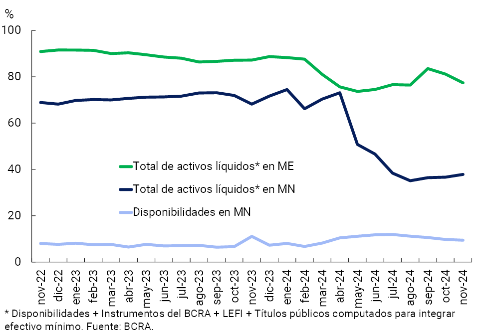 9 Al considerar adicionalmente la tenencia de LECAP cuyo plazo residual es inferior a 3 meses, el indicador amplio de liquidez sistémica en moneda nacional ascendería a 43,9% de los depósitos en pesos a fines de noviembre (+0,8 p.p. respecto a octubre).