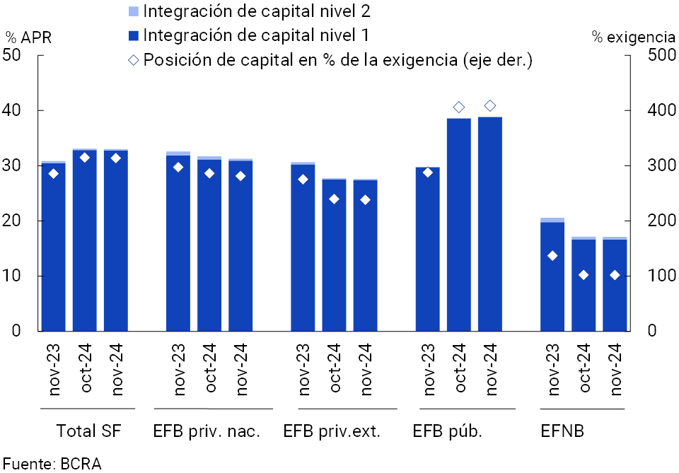 • El ratio de capital regulatorio (RPC) como porcentaje de los activos ponderados por riesgo (APR) del sistema financiero no presentó cambios de magnitud en noviembre, manteniéndose en niveles relativamente elevados (33%, frente a un promedio de 22% en los últimos 10 años). Este desempeño mensual se dio en un contexto en cual la RPC y los APR del conjunto de entidades crecieron en torno a 3% real en el mes. En este marco, en el período el exceso de capital regulatorio (integración menos exigencia) del sistema financiero totalizó 314% de la exigencia normativa y 51,8% del saldo de crédito al sector privado (neto de previsiones).