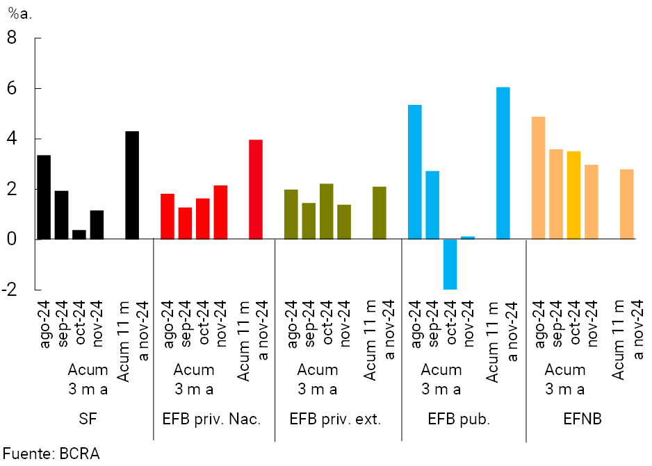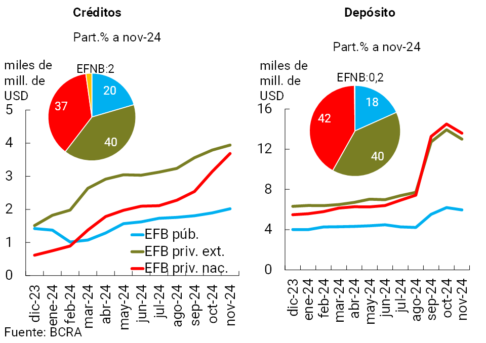 • En noviembre el saldo real de los depósitos en pesos del sector privado aumentó 2,5%. El saldo real de los depósitos a plazo creció 5,8% en el mes, mientras que las cuentas a la vista se incrementaron 0,7% real en el período. Con respecto al segmento en moneda extranjera, el saldo de depósitos del sector privado se redujo 6% en noviembre —en moneda de origen—. No obstante, en una comparación interanual el saldo de depósitos en moneda extranjera del sector privado se incrementó 130,3%.