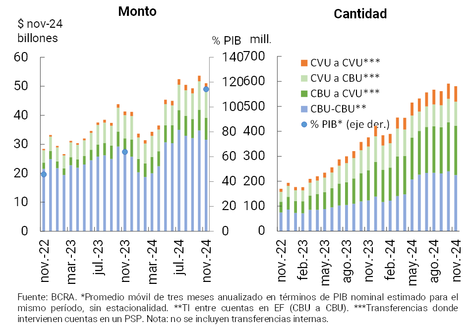 11 En términos interanuales a noviembre, la cantidad de TI entre CVU aumentó 67,4% (51,3% en montos reales), mientras que aquellas entre CBU crecieron 82,9% (20,8% en montos reales). Por su parte, las operaciones entre CBU y CVU registraron un incremento de 62,6% interanual (44,7% en montos reales), en tanto que las de CVU a CBU crecieron de forma más moderada, 1,9% interanual (25,7% en montos reales).