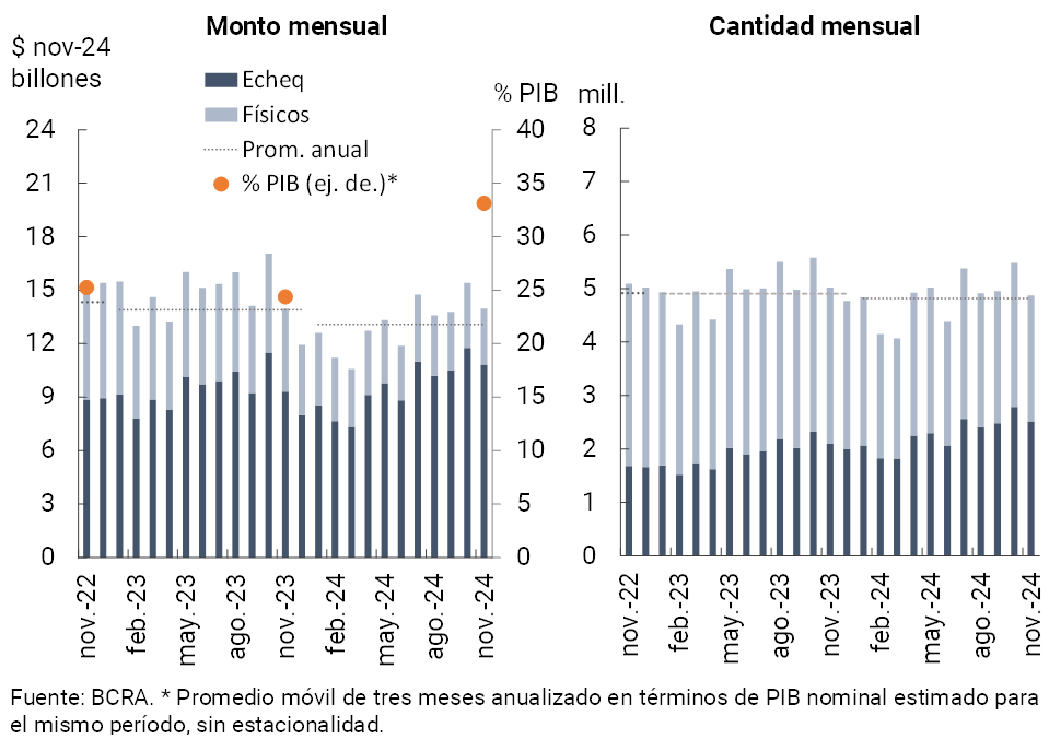 13 En noviembre el importe promedio de los cheques compensados fue de $2,9 millones ($1,3 millones en el formato físico y $4,3 millones en ECHEQs). El valor promedio mensual para 2024 para el total compensado ascendió a $2,7 millones, a precios de noviembre.