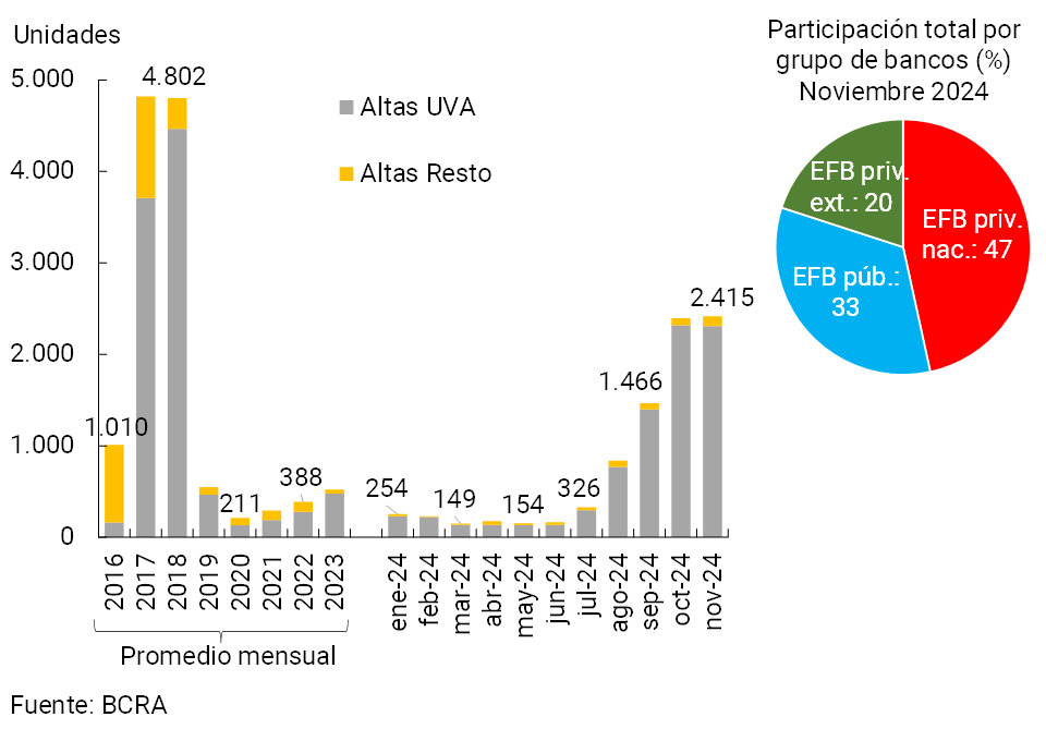 Las líneas de crédito con garantías hipotecarias continuaron creciendo en noviembre, aumentando 3,9% real respecto a octubre —incluyendo capital y ajuste de los préstamos en UVA—. Se estima que en el mes se verificaron unas 2.400 “altas” de deudores hipotecarios (personas humanas) (ver Gráfico 4). casi la mitad de las “altas” hipotecarias de noviembre fueron canalizadas por las entidades financieras privadas nacionales.