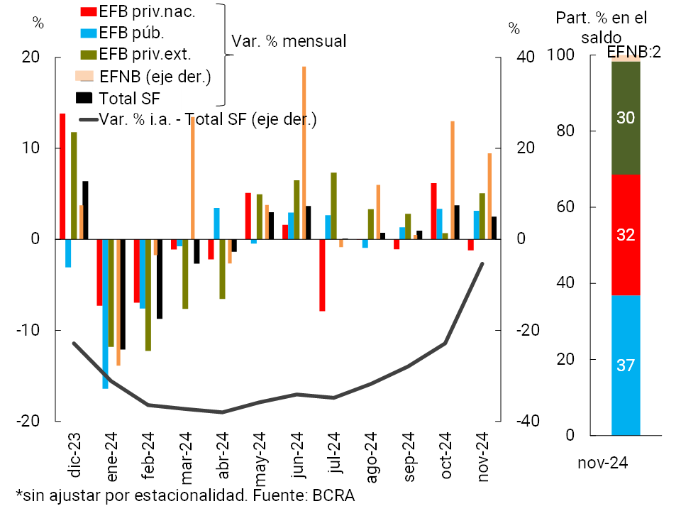 El saldo de crédito al sector privado en moneda extranjera aumentó 9,1% en noviembre —en moneda de origen—. El incremento en el período fue impulsado principalmente por los documentos y las prefinanciaciones a la exportación (en conjunto explicaron más del 90% del incremento mensual) y por las entidades privadas nacionales (ver Gráfico 2).