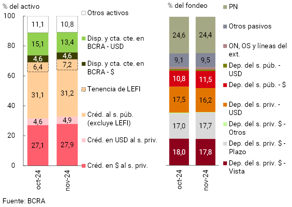 En noviembre el tamaño de la hoja de balance del sistema financiero continuó creciendo. El activo total del sector aumentó 1,5% en términos reales en el mes y acumuló un incremento real de 10% i.a.