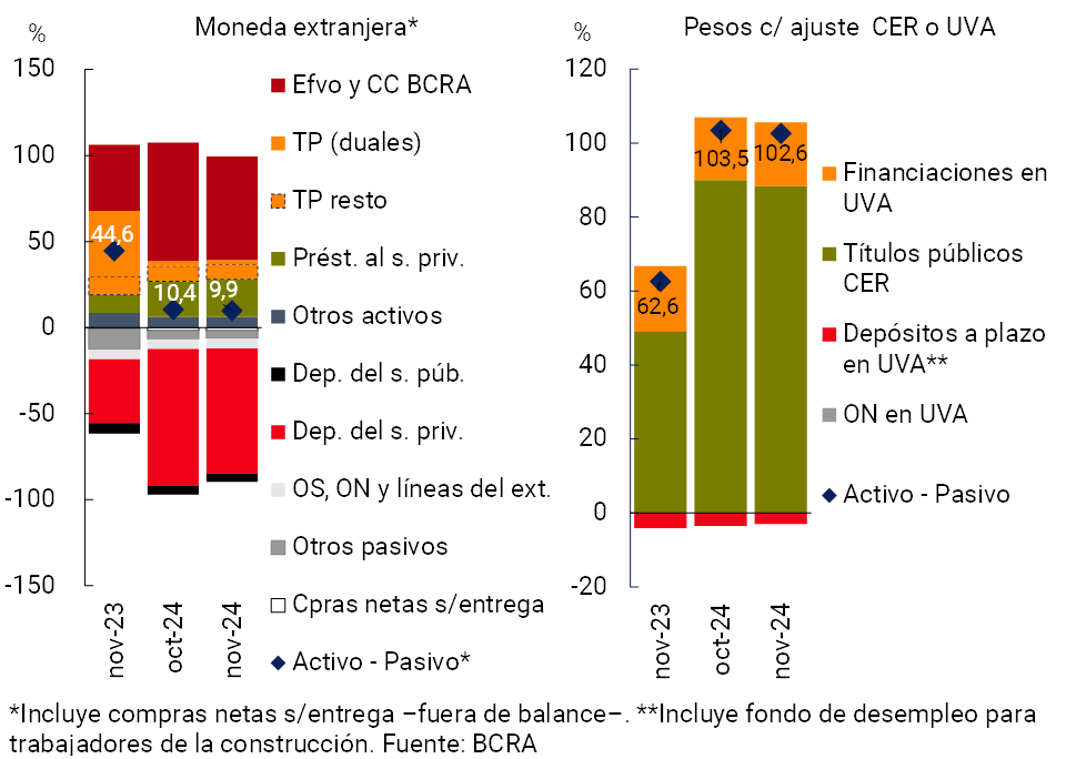 El diferencial estimado entre los activos y pasivos en moneda extranjera del sistema financiero se redujo ligeramente en noviembre, ubicándose en 9,9% del capital regulatorio –RPC– para el total del sector (-34,7 p.p. i.a., ver Gráfico 7)4. Por otro lado, se estima que el diferencial entre las partidas en pesos ajustables por CER (o bien, pactadas en UVA) alcanzó 102,6% de la RPC del sector en el mes, 0,8 p.p. por debajo del nivel de octubre (+40 p.p. i.a.).