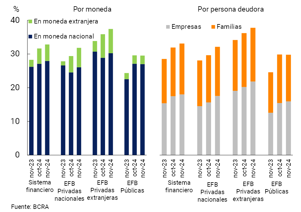 • En noviembre el saldo de crédito en pesos al sector privado se incrementó 4,6% en términos reales. Este desempeño resultó generalizado entre los grupos de entidades financieras. Al distinguir por líneas crediticias, el aumento mensual fue impulsado mayormente por los préstamos al consumo, seguidos por los créditos con garantía real y los comerciales. El saldo real de las financiaciones en pesos al sector privado acumuló un aumento de 17,2% i.a. y una expansión de 66,2% desde fines de abril de 2024 —momento en que volvió a crecer el crédito en pesos—. Por su parte, el saldo de crédito al sector privado en moneda extranjera aumentó 9,1% en noviembre —en moneda de origen—, totalizando un incremento de 147,9% i.a.