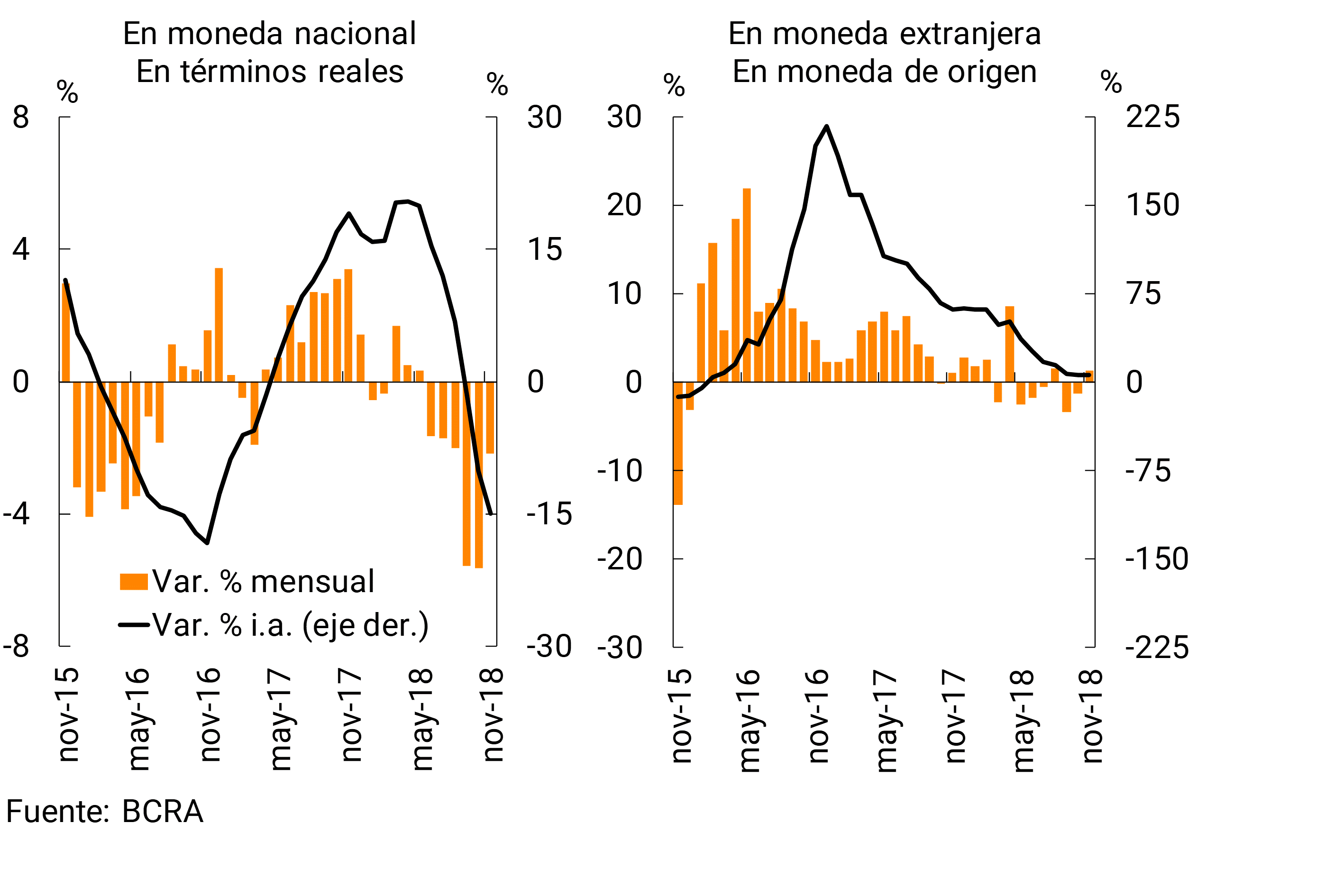En una comparación interanual, el saldo de financiaciones en pesos al sector privado continuó reduciéndose en noviembre, alcanzando un caída de 14,9% al ajustar por inflación (ver Gráfico 10).12 Por su parte, los préstamos en moneda extranjera se incrementaron 6,4% i.a., manteniéndose prácticamente sin cambios respecto al registro del mes anterior.