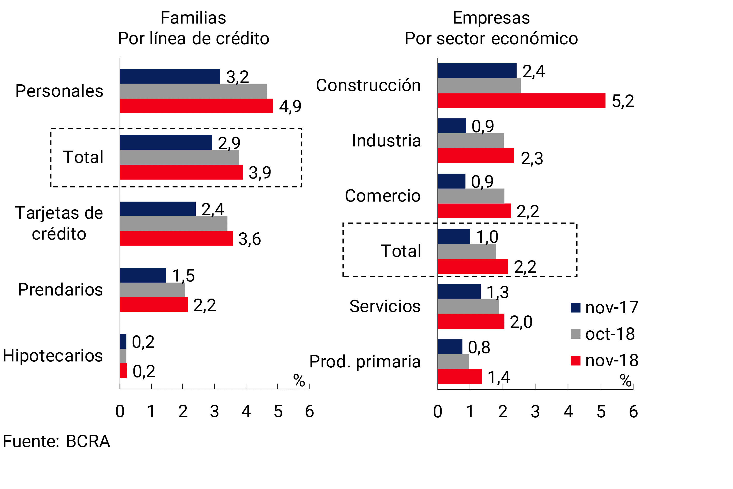 13 Información extraída de la Central de Deudores (comprende tanto moneda nacional como extranjera). No se incluyen los créditos a residentes en el exterior. Se consideran los ajustes de capital e intereses devengados. Las financiaciones a empresas se definen aquí como aquellas otorgadas a personas jurídicas y el financiamiento comercial otorgado a individuos. Por su parte, se considera préstamos a familias a aquellos otorgados a individuos, excepto que tengan destino comercial.