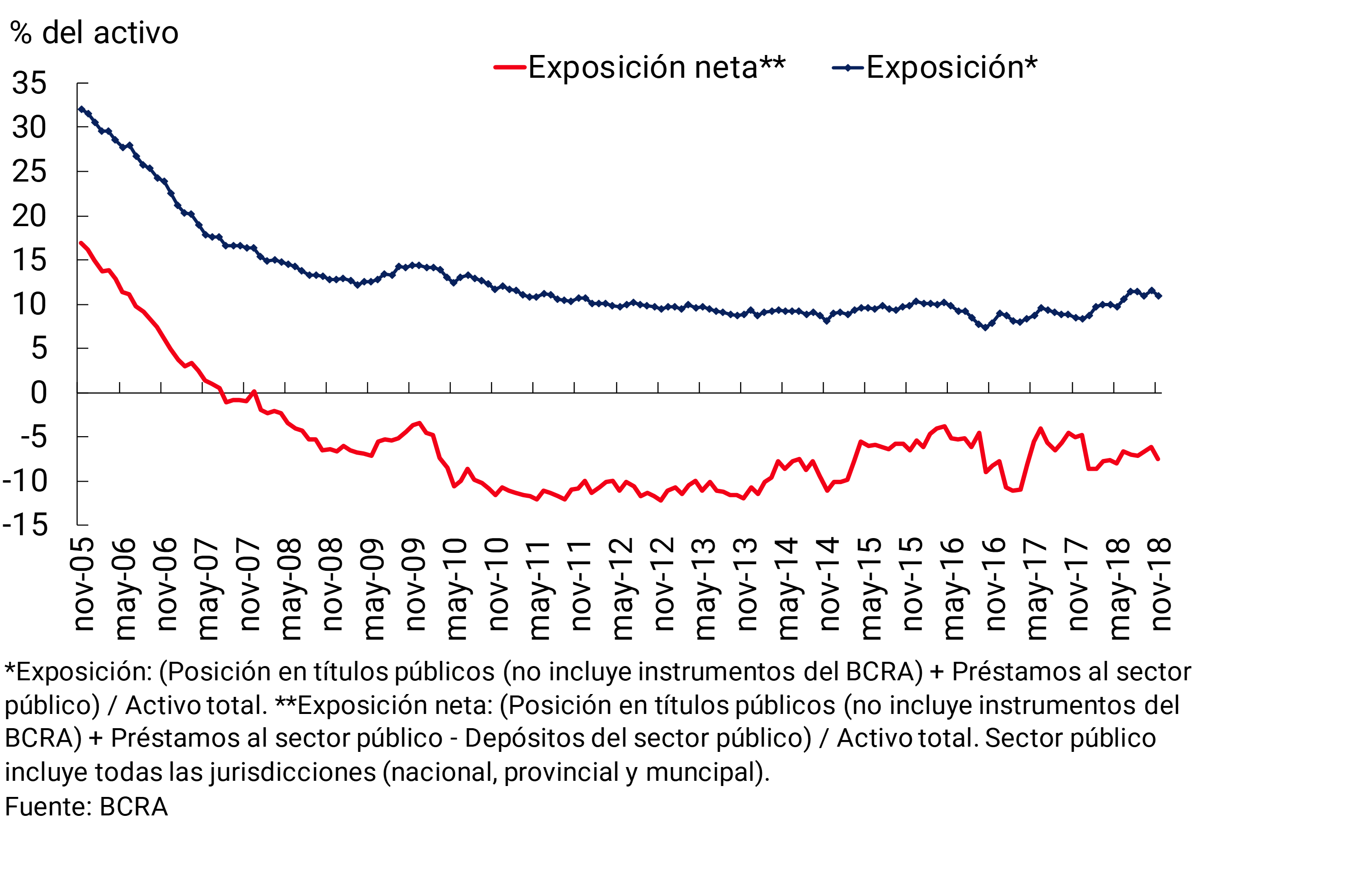 En noviembre la exposición patrimonial del sistema financiero al sector privado permaneció en valores bajos en torno a 1,3%, nivel que resulta similar al observado un año atrás.20 Por su parte, en el mes la exposición bruta del conjunto de entidades financieras al sector público representó 11% del activo total, 0,6 p.p. por debajo del valor del mes pasado y 2,5 p.p. por encima del nivel de un año atrás (ver Gráfico 16). Adicionalmente, si se netea el saldo de depósitos del sector público, la exposición del sistema financiero a este sector se ubicaría en -7,5% del activo total en el mes.
