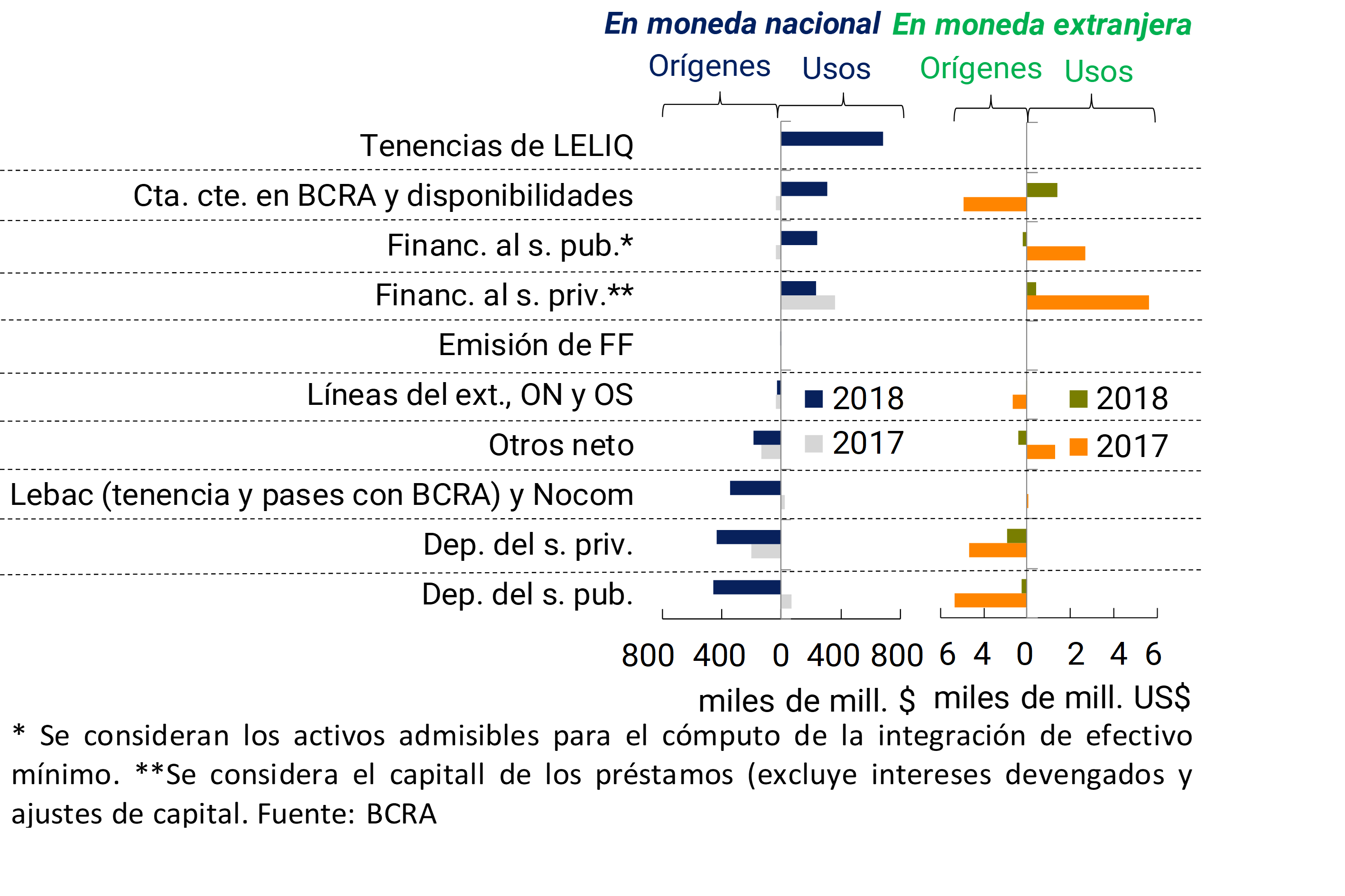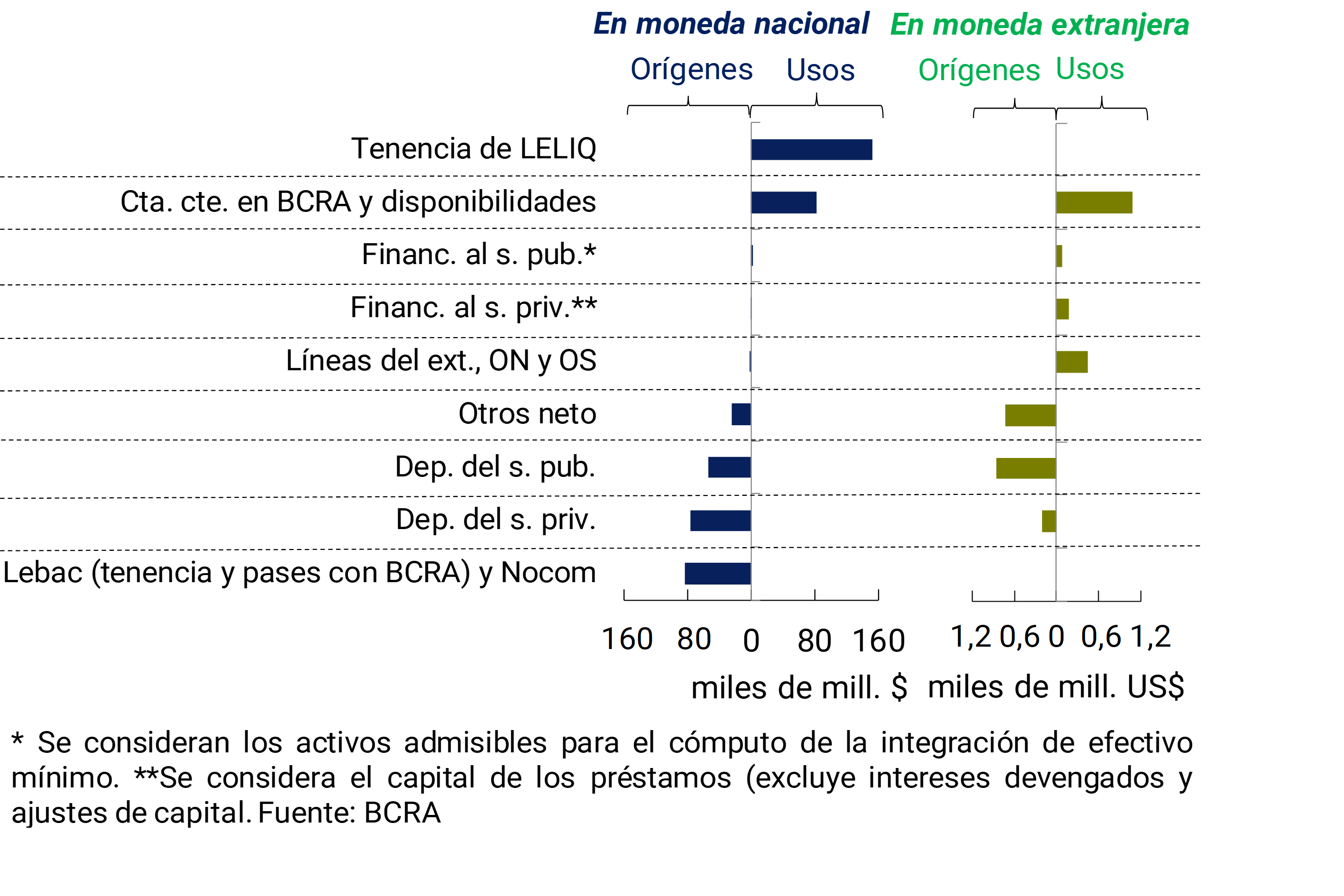 Activos líquidos: disponibilidades (integración de “efectivo mínimo” en cuenta corriente en el BCRA y en cuentas especiales de garantía y otros conceptos, fundamentalmente efectivo en bancos y corresponsalías) más el saldo acreedor neto por operaciones de pases de las entidades financieras contra el BCRA utilizando LEBAC y NOBAC.