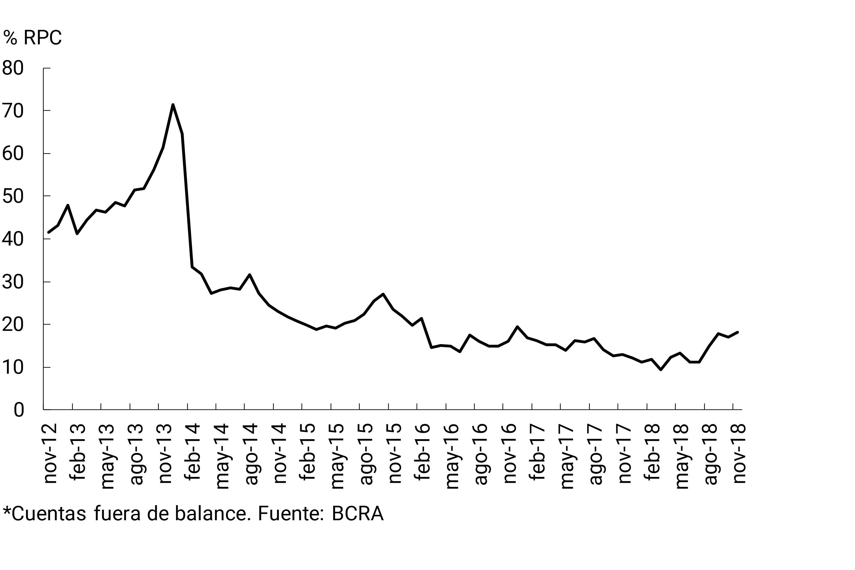 En noviembre el sistema financiero presentó un descalce activo de moneda extranjera equivalente a 18,2% de la RPC —Responsabilidad Patrimonial Computable—, levemente por encima del registro del mes pasado (ver Gráfico 4). El aumento fue impulsado por los bancos extranjeros y provino del diferencial entre activos y pasivos dentro del balance bancario, ya que las compras a término de moneda extranjera (clasificadas en partidas fuera de balance) se redujeron en el mes. En términos interanuales este indicador se incrementó a nivel agregado 5,1 p.p. de la RPC. Por su parte, considerando los rubros ajustables por CER, se estima que en noviembre el descalce activo de los bancos fue equivalente a poco más de la mitad del capital regulatorio, creciendo levemente con respecto al nivel de octubre. Cabe recordar que los bancos públicos concentran la mayor parte de este descalce.