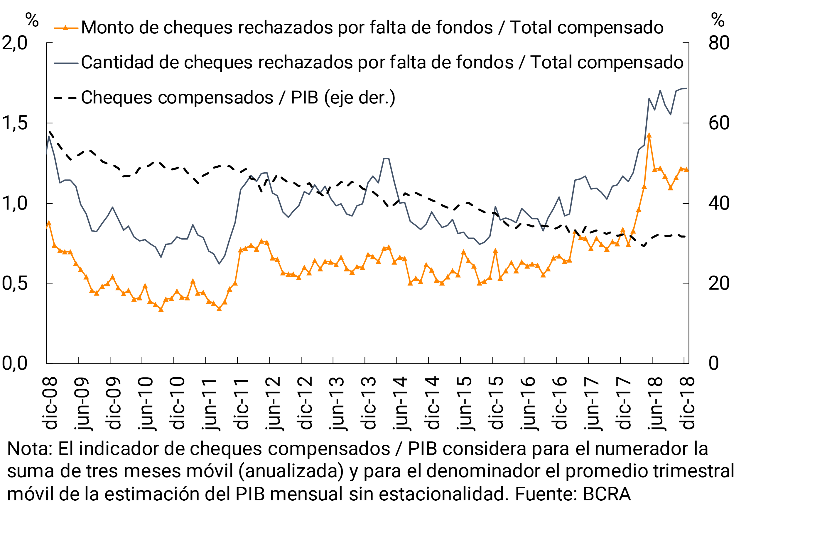 En este contexto, durante el último mes del año el rechazo por falta de fondos en términos del total compensado se mantuvo en niveles similares a los del mes anterior, 1,7% y 1,2%, en cantidades y valores, respectivamente (ver Gráfico 5).