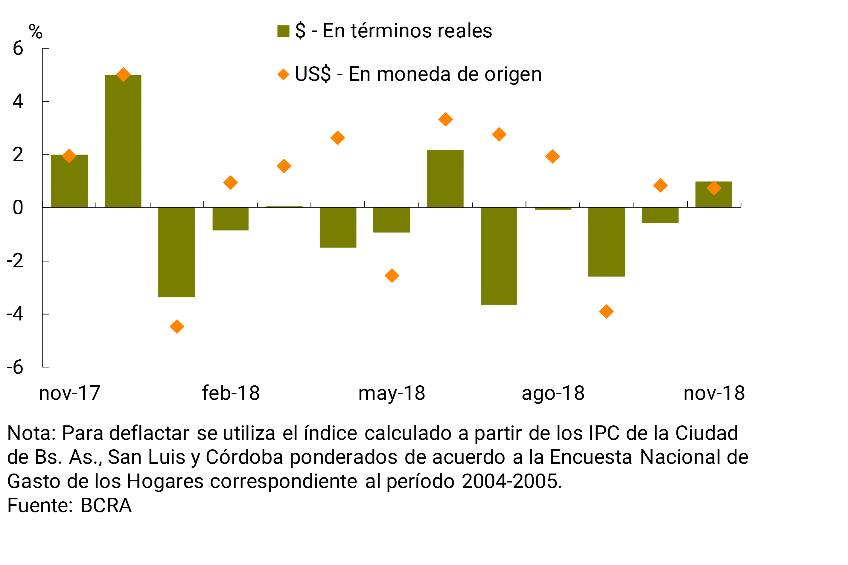 • En noviembre el saldo total de los depósitos en pesos se incrementó 2,1% en términos reales, tanto por las imposiciones del sector público (+3,6% real) como del sector privado (+1% real). Dentro de este último segmento, las colocaciones a plazo crecieron 2,1% en el mes, mientras que las cuentas a la vista se redujeron levemente —ambos valores ajustados por inflación—.