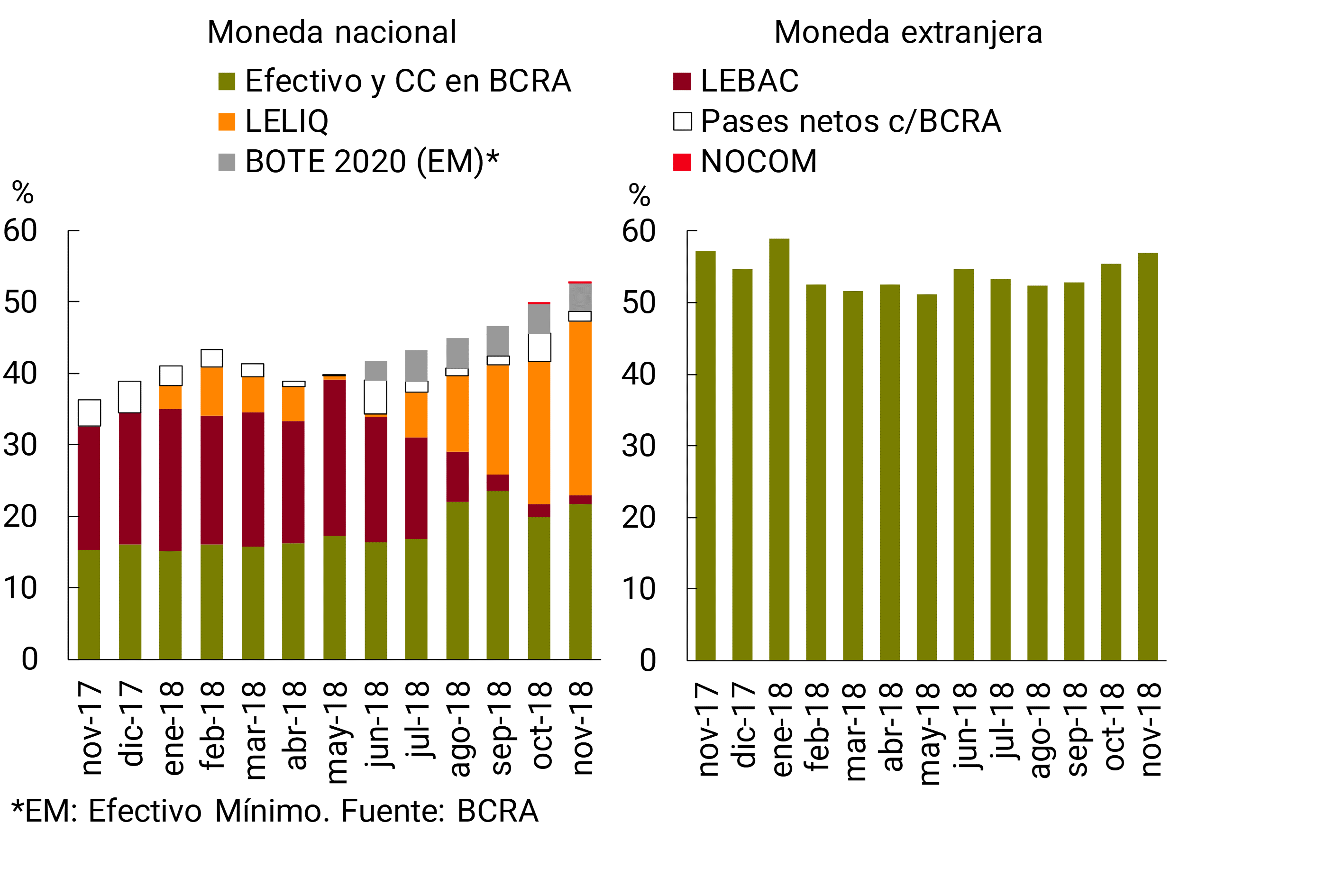 6 Para las colocaciones con plazo residual de entre 30 y 59 días, los requisitos se establecieron en 10% en efectivo, 5% en BOTES 2020 y 10% en LELIQ, mientras que para aquellos depósitos con plazo residual de 60 a 89 días se redujeron a 5%, 2% y 0%, respectivamente. Los depósitos con un plazo residual superior a 90 días no tienen requisito de efectivo mínimo.